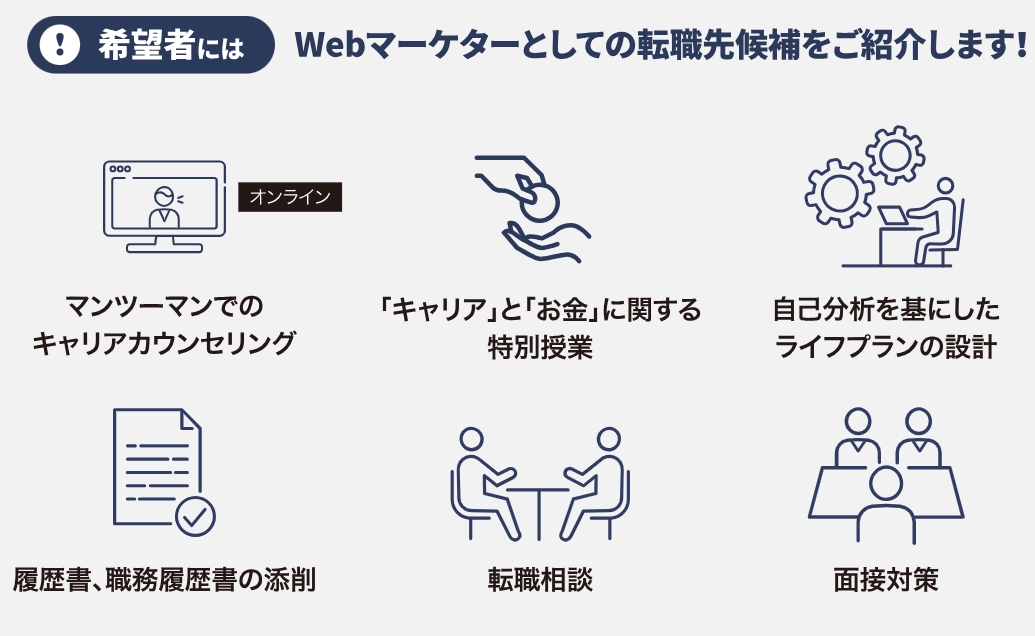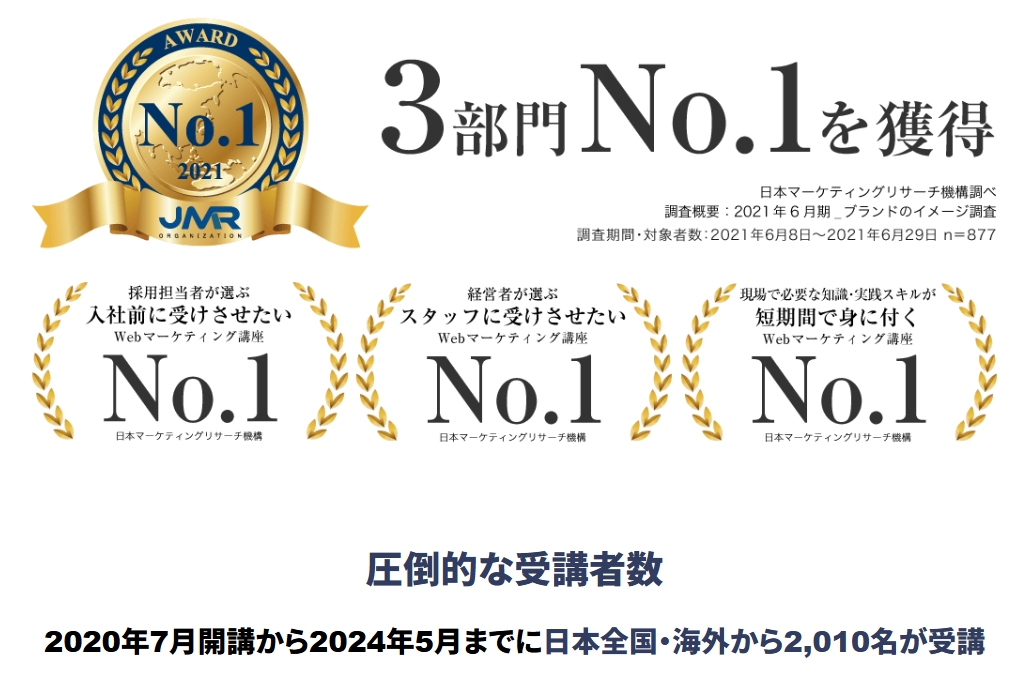 Webマーケティング未経験の方でも、最短でプロレベルの実力を身につけることができ、副業・転職・フリーランスなど、さまざまなキャリアパスにつながると評判です。