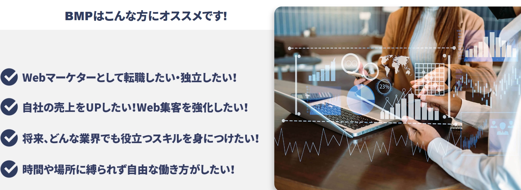 BMP(Business Marketing Program)は、初心者でも短期間でWebマーケティングの実務力を身につけられるオンライン講座です。特に、以下のような方に向いています。
